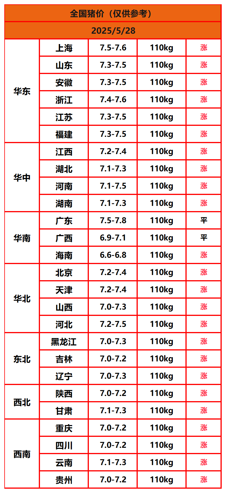 2025年5月28日猪价,今日全国猪价行情走势:24涨2平0跌。