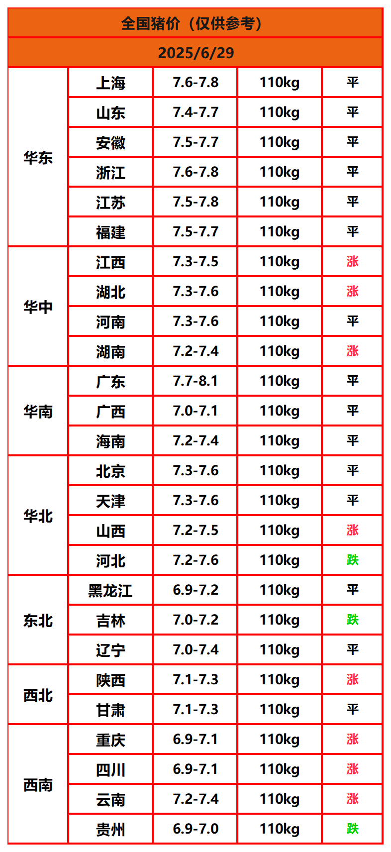 2025年6月29日猪价,今日全国猪价行情走势:8涨15平3跌。