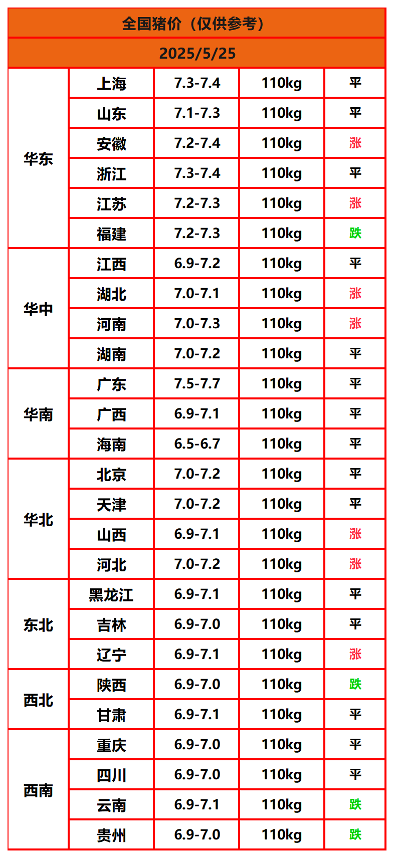 2025年5月24日猪价,今日全国猪价行情走势:0涨5平21跌。